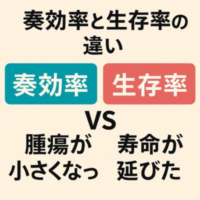 奏効率は「短期的な腫瘍縮小」を見る指標。生存率は「長期的な生命予後」を見る指標。
