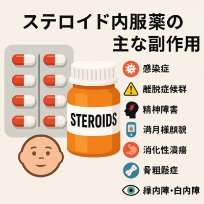 副作用による自己判断での中止や減量を回避するために、ステロイドが治療上必要であることや副作用の発現する時期や対処法について十分に指導する必要がある。