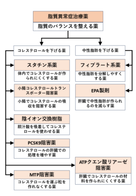 | ・HMG-CoA還元酵素阻害薬(スタチン) ・小腸コレステロールトランスポーター阻害薬 ・陰イオン交換樹脂(レジン) ・プロブコール ・PCSK9阻害薬 ・MTP阻害薬 | ・フィブラート系薬 ・ω-3系多価不飽和脂肪酸 ・ニコチン酸誘導体 |