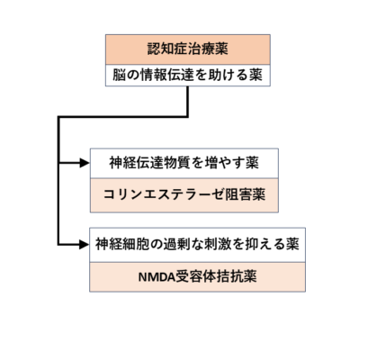 認知症治療薬には、アリセプトなどのコリンエステラーゼ阻害薬と、メマリーがある。
