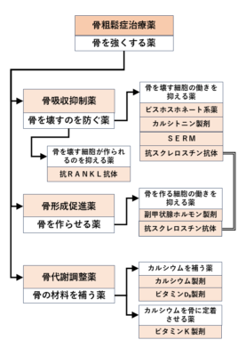骨を作る働きを高める薬は骨形成促進薬。骨を壊す働きを抑える薬は骨吸収抑制薬。