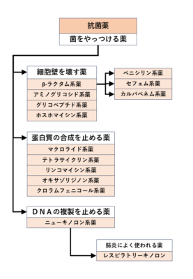 | ●細胞壁合成阻害薬 ・βラクタム系薬(ペニシリン系薬、セフェム系薬、カルバペネム系薬、モノバクタム系薬、ペネム系薬) ・グリコペプチド系薬 ・ホスホマイシン系薬 ●アミノグリコシド系薬 ●核酸合成阻害薬 ・キノロン系薬 ・ニューキノロン系薬 ●細胞膜機能障害薬 ・リポペプチド系薬 ・ポリペプチド系薬 | ●タンパク質合成阻害薬(アミノグリコシド系薬除く) ・マクロライド系薬 ・リンコマイシン系薬 ・オキサゾリジノン系薬 ・ストレプトグラミン系薬 ・クロラムフェニコール系薬 ・テトラサイクリン系薬 ●葉酸合成阻害薬 ・サルファ剤 ・ST合剤 |