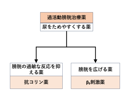 M₃アセチルコリン受容体に対する刺激をブロックして膀胱平滑筋の収縮を妨げる(抗コリン薬)。あるいは、β₃アドレナリン受容体を刺激して、膀胱平滑筋を弛緩して、膀胱を広げる(β₃刺激薬)。