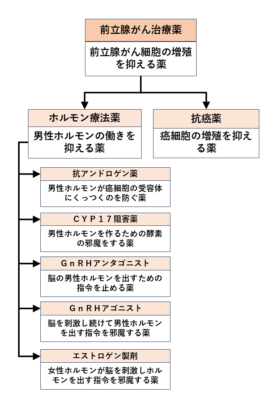 このため治療の第一選択としては、ホルモン療法(アンドロゲン除去療法, Androgen Deprivation Therapy: ADT)が行われ、主に以下の2つの経路でアンドロゲン作用の遮断を目指します。