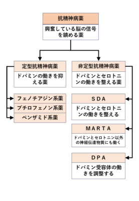 これらの非定型抗精神病薬はさらに化学構造や作用特性から、Serotonin-Dopamine Antagonist(SDA)、Multi-Acting Recepter Targeted Antipsychotics(MARTA)に分類する考え方があります。